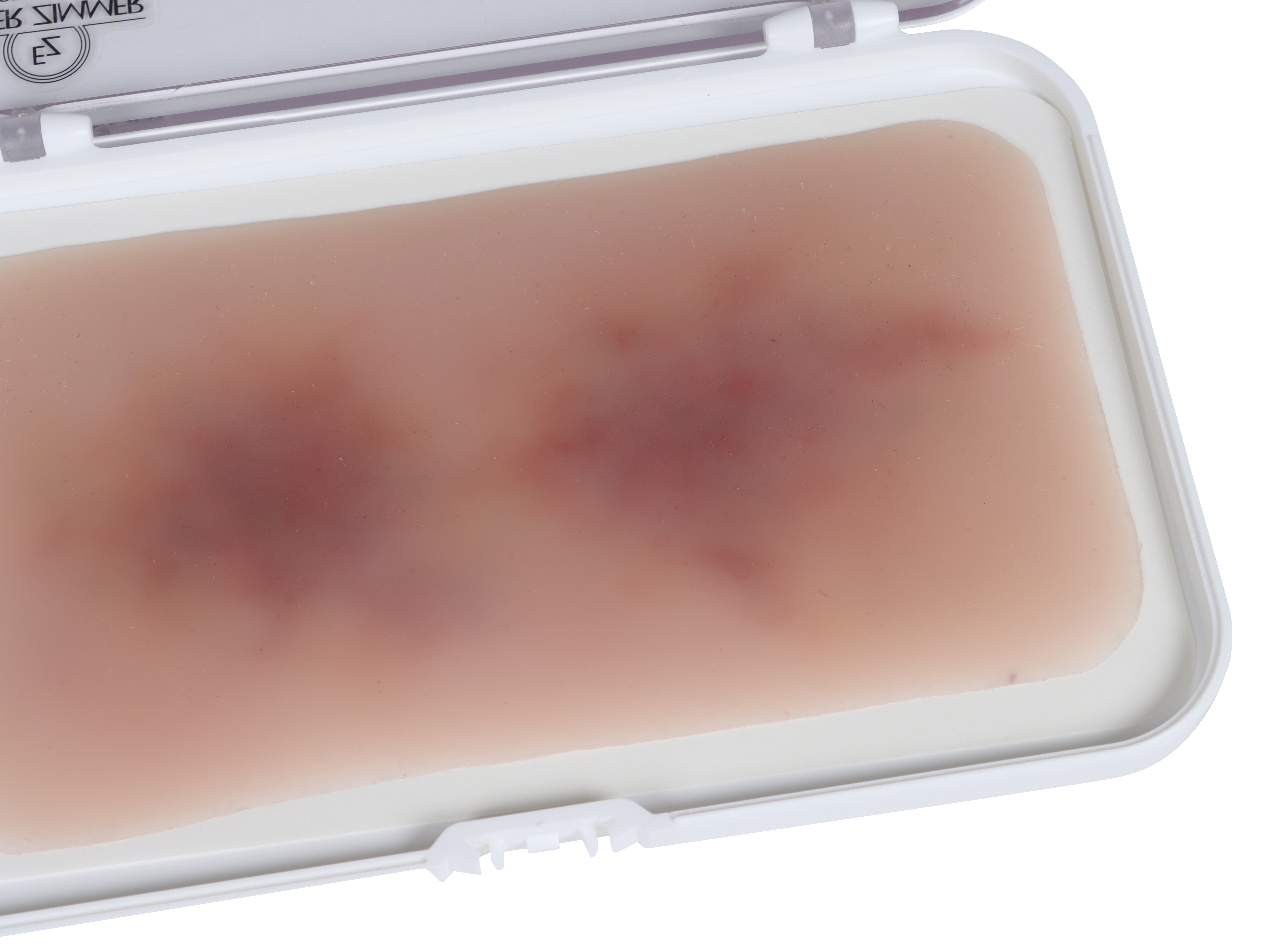 Alle Wunden werden in passenden Transportboxen geliefert. Herstellung in Deutschland. Die Wunden haften selbstständig ✓ auf Haut ✓ auf Puppen können für längeren Gebrauch oder verbesserte Haftung (z. B. bei Szenarien mit viel Bewegung) zusätzlich mit Hautkleber befestigt werden.