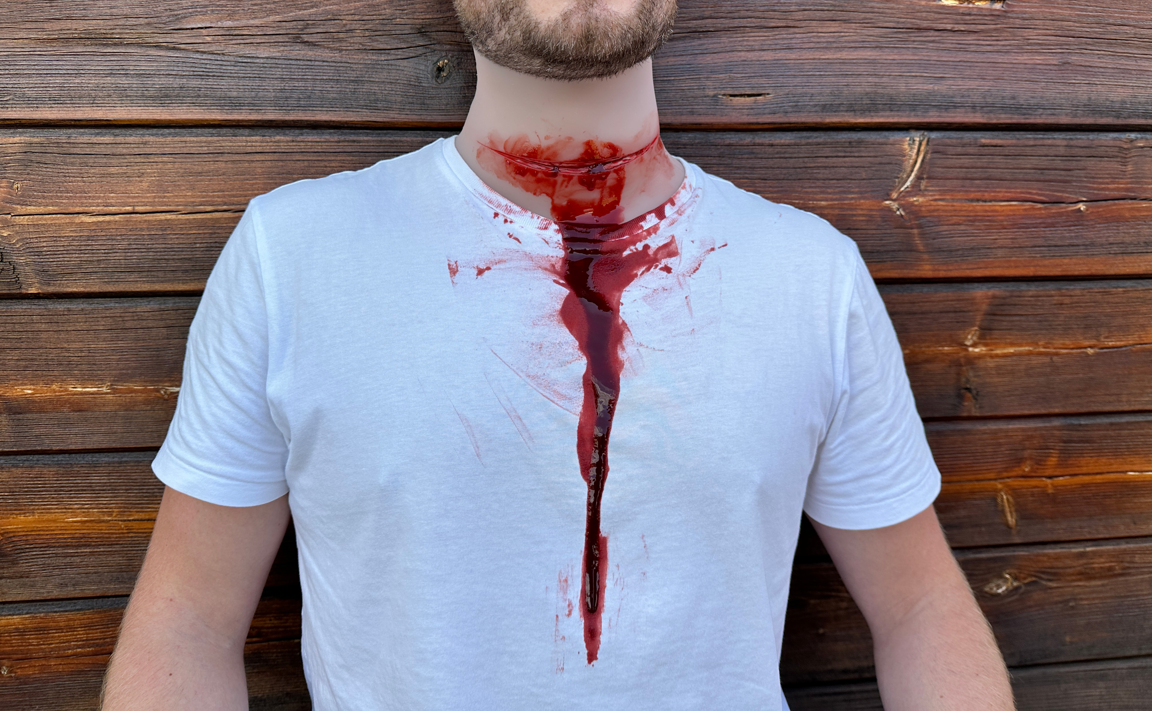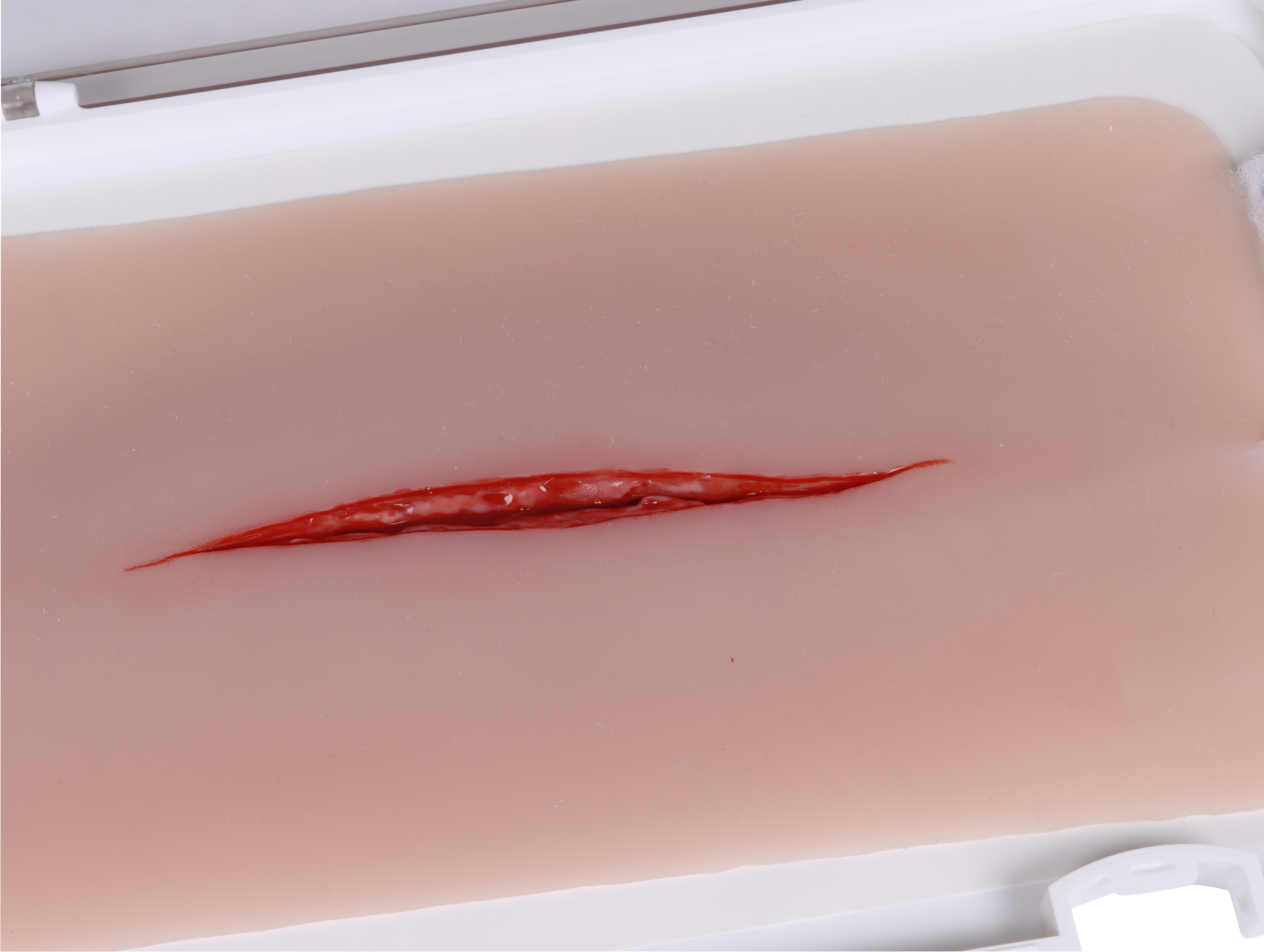 Mit Blutungsfunktion Die grossen Wunden besitzen eine Blutungsfunktion. Ein eingearbeiteter, nicht sichtbarer Schlauch ermöglicht es, die Wunde eigenständig bluten zu lassen. Der Schlauch ist mit einem Infusionsbeutel verbunden, welcher mit künstlichem Blut gefüllt werden kann.