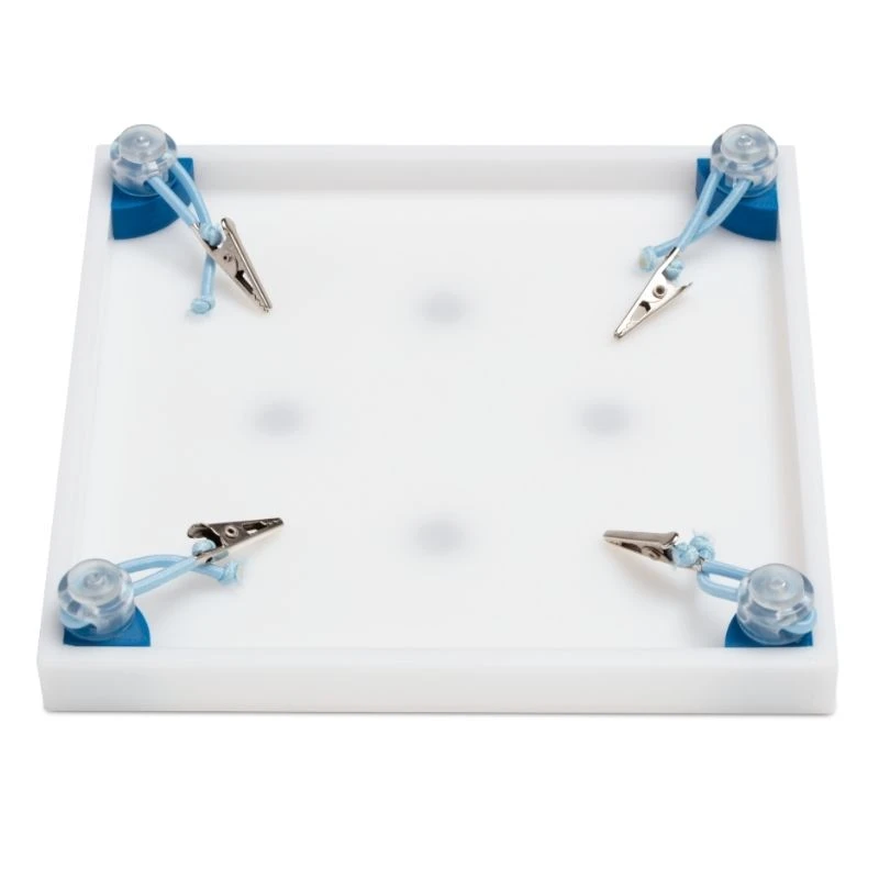 Die Halterung eignet sich für verschiedene Module, wie z. B. Nähen, Schneiden von Kreisen, Darm- oder Anastomose-Training. Zudem können auch organische Materialien (z. B. Banane, Hühnerbein etc.) in das Training integriert werden.